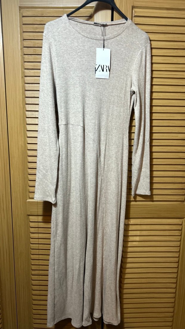 Bej renkte, uzun kollu ve bisiklet yaka keten kumaştan yapılmış, rahat kesimli kadın elbisesi. Günlük kullanım için uygundur.