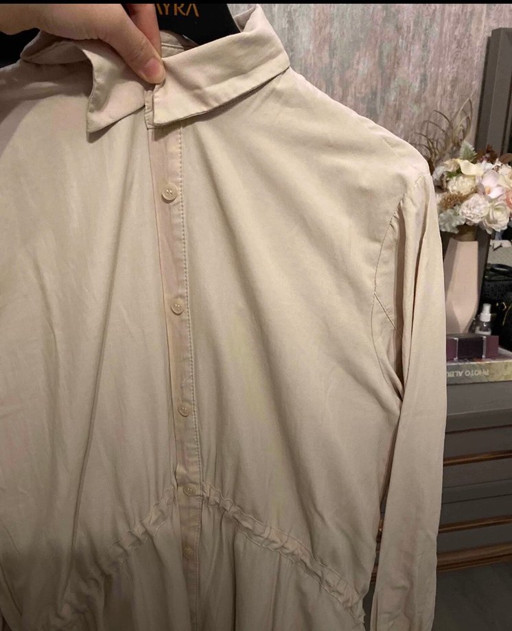 Bej renkli, keten kumaştan uzun kollu ve düğmeli, yakalı uzun kesim kadın elbisesi. Rahat ve salaş kesimiyle Paris tarzı günlük kullanıma uygun. 38,40 beden uyumlu