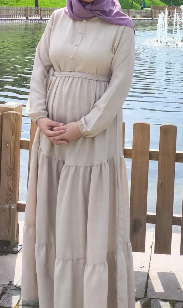 Bej renkte, keten kumaştan uzun kollu ve yüksek yakalı kadın elbisesi. Salaş ve drapeli kesimiyle sade, bohem ve mütevazı bir stil sunar.