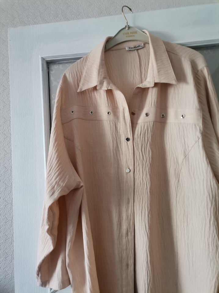 Bej renkli keten kumaştan, düğmeli, uzun kollu, yakası kesik detaylı ve bol kesim uzun gömlek. Rahat günlük kullanıma uygundur. 54 bedendir aldım ama bol kesim olduğu için çok büyük.. oldu....