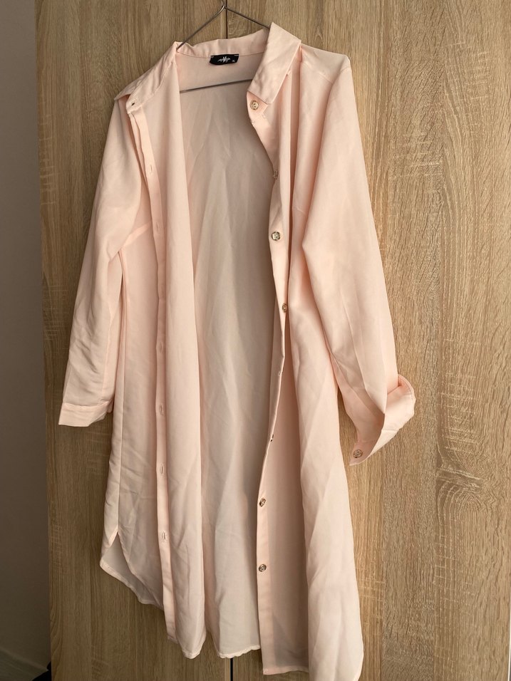 Bej renkli, keten kumaştan uzun kollu ve düğmeli, notched lapel yakalı bol kesim kadın gömlek. Minimal ve gündelik kullanıma uygun.Beden olarak xl ama kalıbı M bedene de uyumlu. Bana uzun geliyor ve bazı sebeplerden dolayı kullanamıyorum istenilirse alt kısımdan kestirilerek kullanılabilir