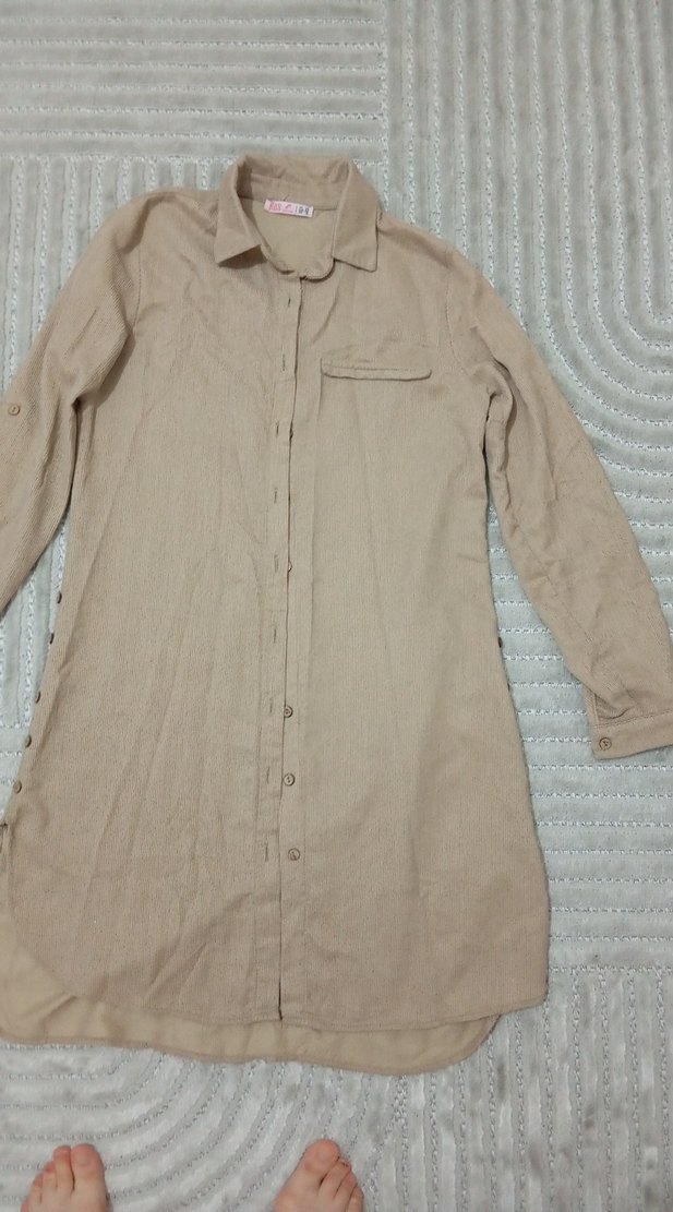 Bej renkli keten kumaştan, düğmeli ve uzun kollu, yakalı, bol kesim kadın gömleği. sayılı giyildi sorunu yoktur