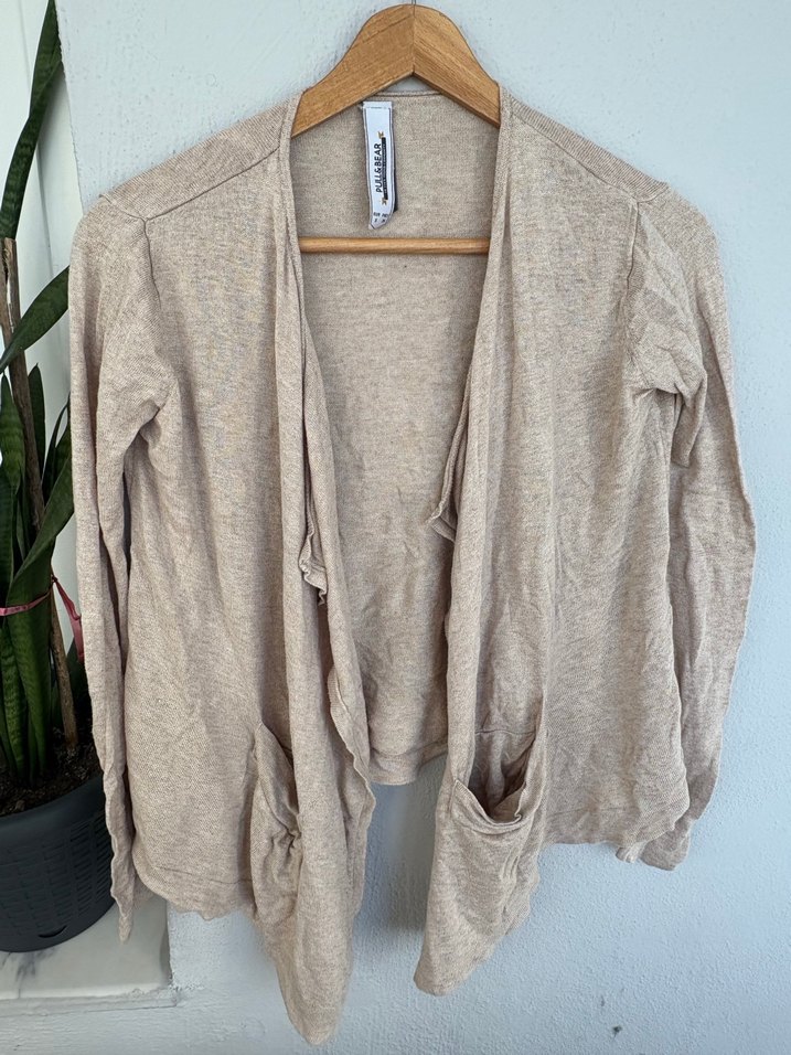 Bej renkte, uzun kollu keten kadın hırka. Salaş kesimi ve bisiklet yaka ile günlük kullanıma uygun bohem ve rahat bir tarz sunar. Midi boyda, zahmetsiz şıklık sağlar.