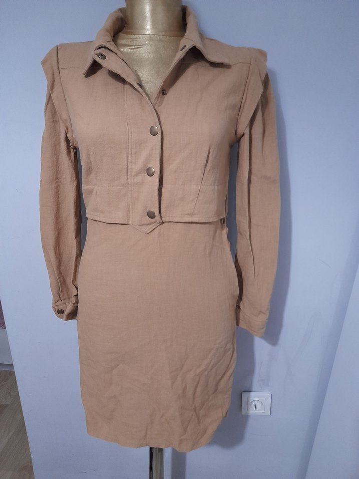 Bej renkli, uzun kollu keten kadın kaban, düğmeli ve keskin yaka detayına sahiptir. Ofis ve sokak stiline uygun, rahat kesimlidir.
