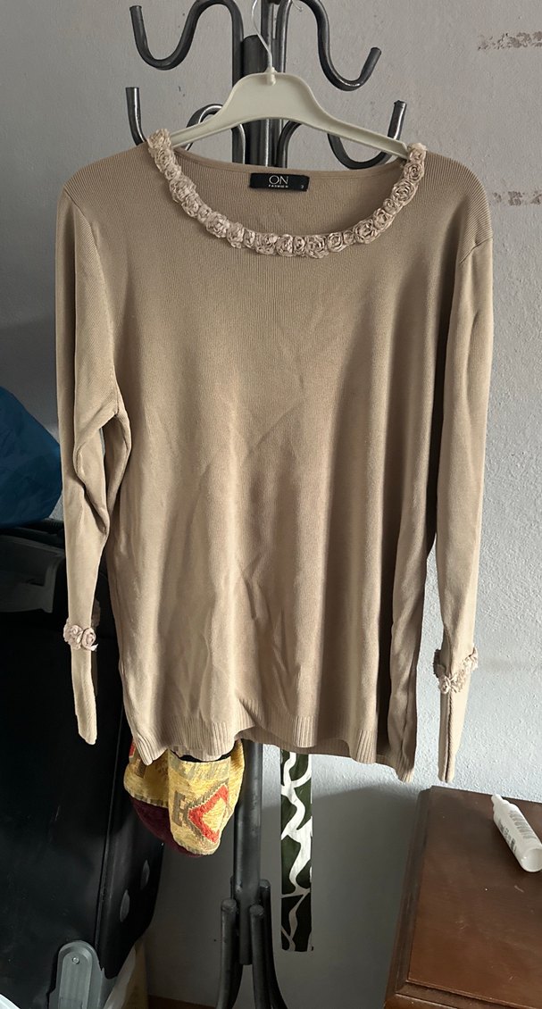 Bej renkli, uzun kollu kadın kazak, çiçek detaylı yuvarlak yaka ve bol kesimiyle rahat ve şık bir görünüm sunar.