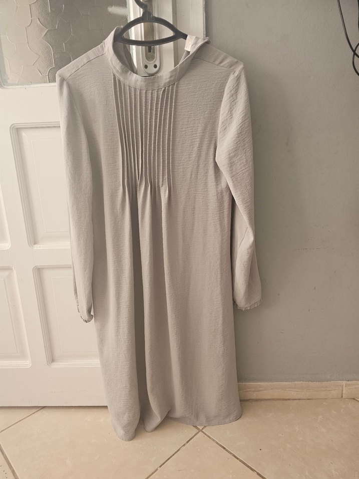 Yumuşak keten kumaştan, yüksek yakalı ve uzun kollu bej kadın tunik. Regular kalıp ve drapeli tasarıma sahip, minimalist günlük kullanım için uygun.