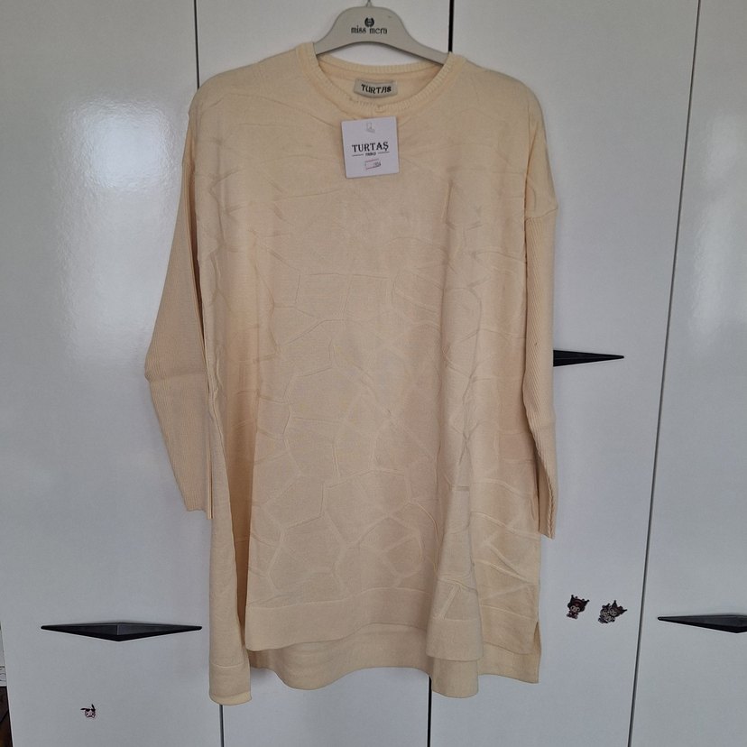 Bej renkli, keten kumaştan, uzun kollu, yuvarlak yakalı, rahat kesim örgü kazak. Marka: TURTAS. etiketli hic kullanılmadı. soğuk sıkım ip cok kaliteli asla tüylerden yapmayacak merserize tunik.kol altindan asagiya dogru bollasiyor.kol altindan eni 58 cm ,baseni 64 cm,etek ucu eni 70 cm,tunik boyu ön 71 cm,arka 77 cm.ben alirken 38 -50 beden arasi uyumludur diye almistim. cm#tunik#kadintunik#bayanmerserizetunik#merserize#merserizetunik