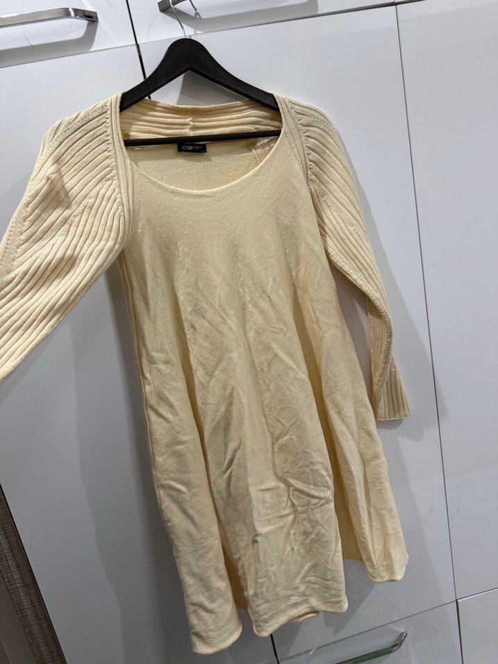Sadece kırışık üründe kusur yoktur Bej renkli, uzun kollu, keten kumaştan kadın kazak. Yuvarlak yakalı, bol kesim ve midi boyda, rahat ve bohem tarzda.