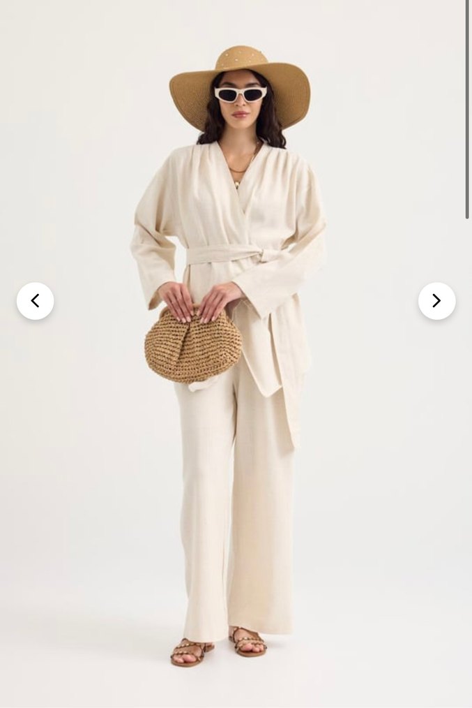 Açık bej renkte, uzun kollu ve notalı yakalı, bol kesim uzun kolu. Düz ve rahat dokusu bulunur.