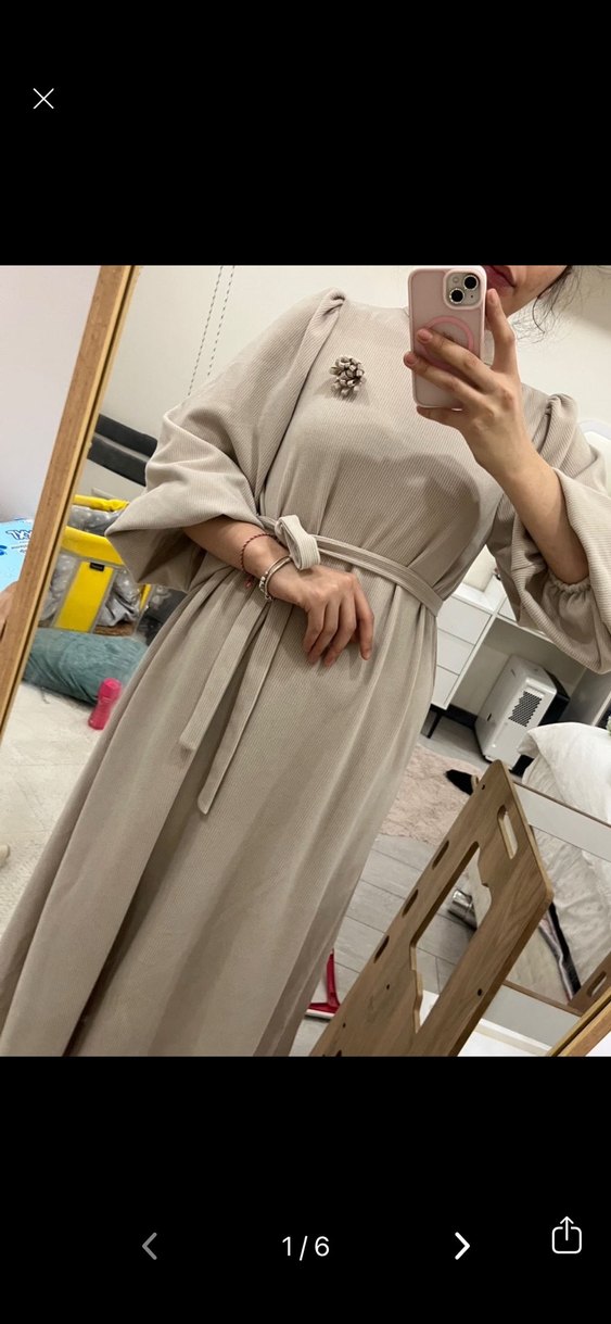 Bej renkte, yüksek yakalı ve uzun kollu, kuşaklı, bol kesim kadın elbisesi. Minimalist tarzıyla günlük kullanıma uygundur yeni gibidir