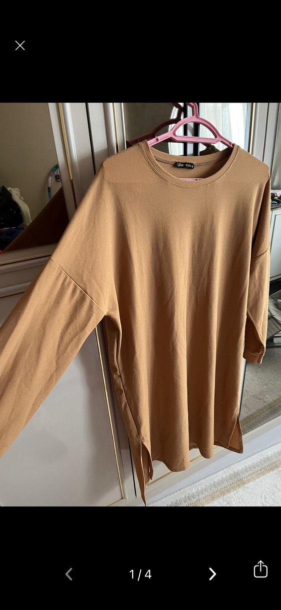 Bej renkli, uzun kollu, yuvarlak yaka, bol kesim midi tunik. Parlak sentetik kumaştan, minimal ve şık tarz için uygun. Ürün 1 kez kullanıldı. Boy 94’ defosu yoktur.