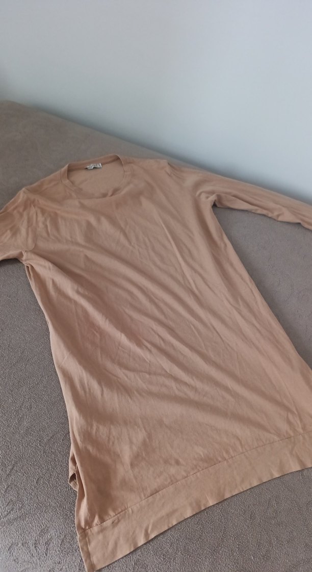 Uzun kollu, yuvarlak yaka bej tişört. Rahat kesimli ve midi boyda, günlük kullanıma uygun minimal tarzda.
