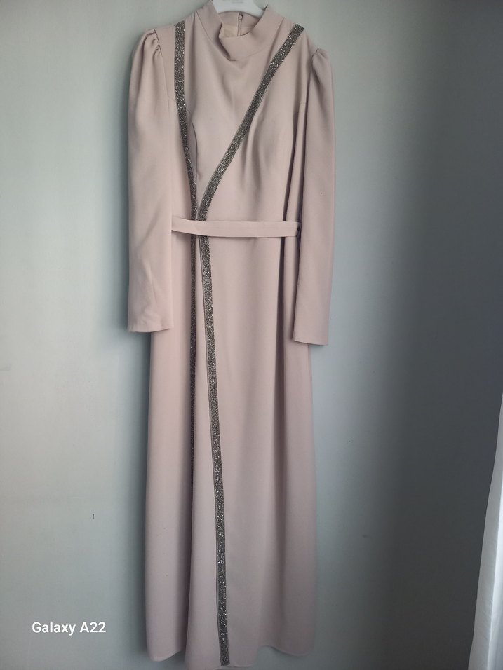 Bej uzun elbise yüksek yakalı, nakış detaylıdır. Drapeli, regular fit ve askılı kollu modern klasik ve minimalist tarzda, ofis için uygundur. 42 beden ama dar kaliptır