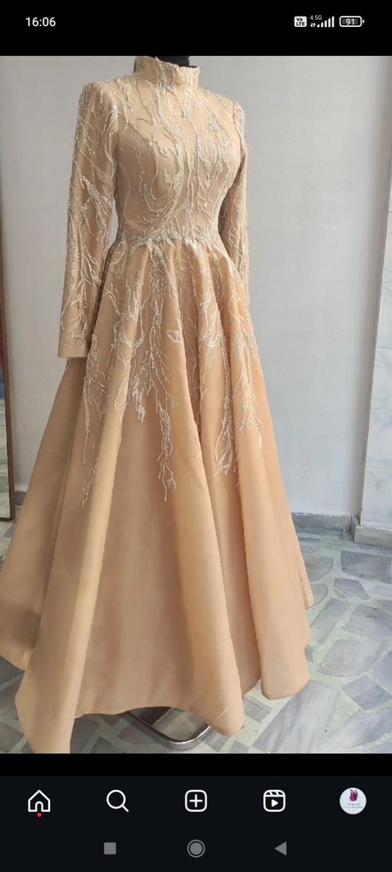 Bej renkli, parlak ve drapeli uzun nişan elbisesi, nakışlı detaylar ve V yaka ile dikkat çeker. Uzun kollu, rahat kesim, modern klasik ve göz alıcı tarzı yansıtır. KİRALIK