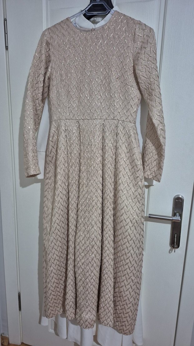 Bej renkli, uzun kollu ve yüksek yakalı örgü elbise, pileli etek ve rahat kesime sahip, düğünler için uygun klasik ve vintage stil.