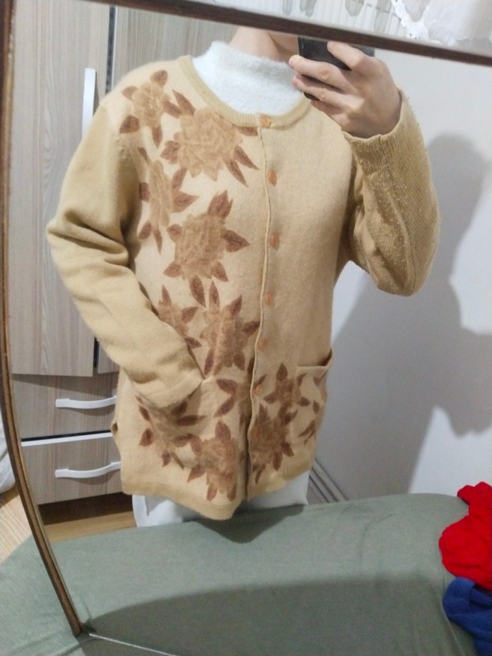 Bej renkli, uzun kollu, yuvarlak yakalı örgü hırka. Çiçek desenleri ve cepler içerir, rahat bir kesime sahiptir.