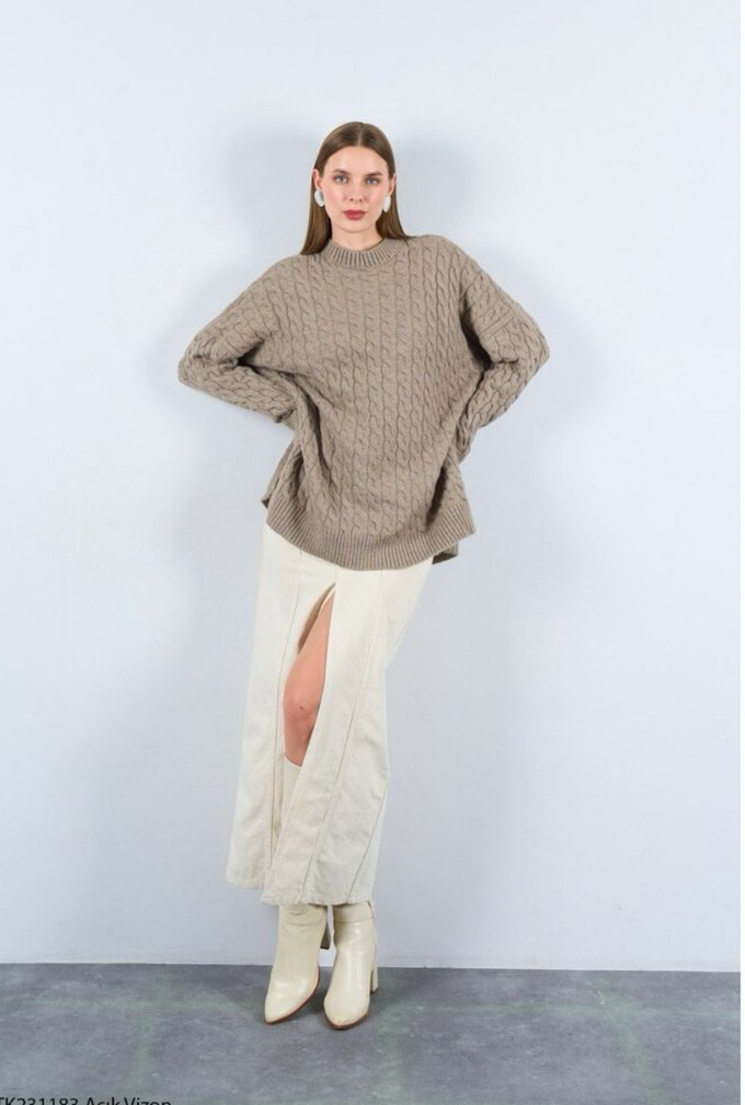 Bej renkli, uzun kollu ve gevşek kesim kadın kazak. Örgü kumaştan üretilmiş, bisiklet yaka ve uzun boyuyla gündelik kullanıma uygundur. Standart bedenlerdedir. 36-42 arası uyumludur
