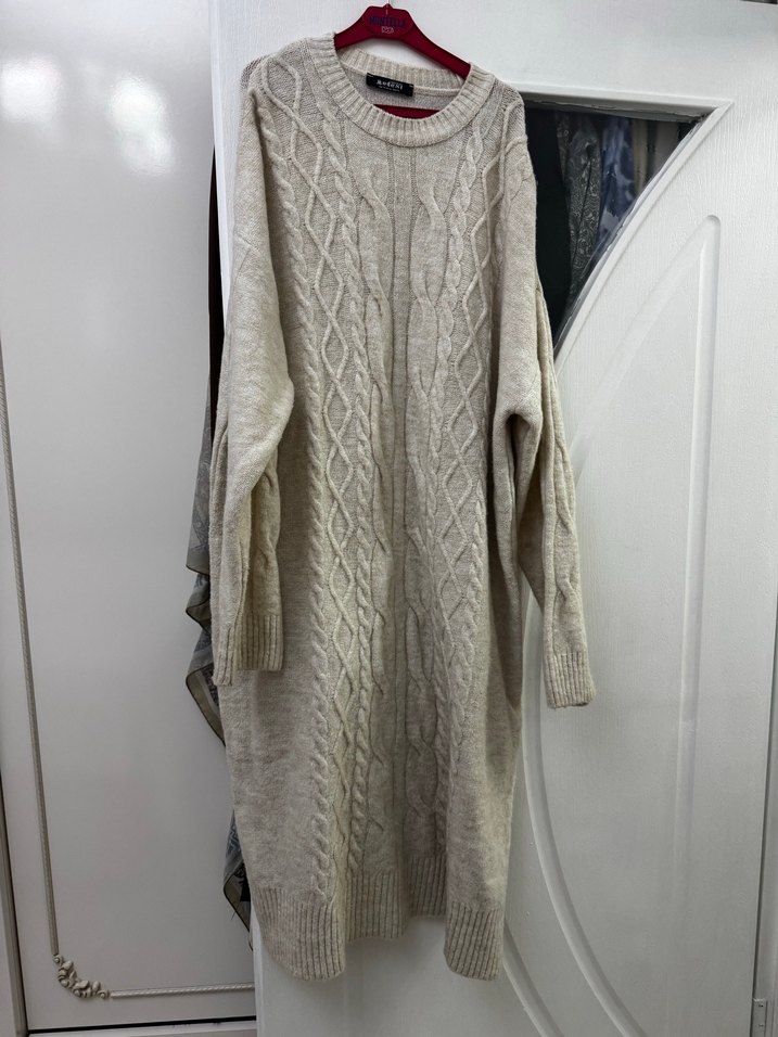 Bej renk, uzun kollu, gevşek kesim ve bisiklet yaka örgü triko kazak. Rahat ve bohem tarzıyla günlük kullanıma uygundur. İki kol arası 60 cm Boy 110