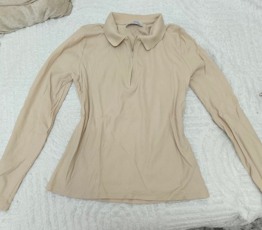 Pamuk kumaştan yapılmış, bej renkli, uzun kollu ve yakalı bu dar kesim bluz, pastel tonu ve normal boyuyla günlük kullanıma uygundur.