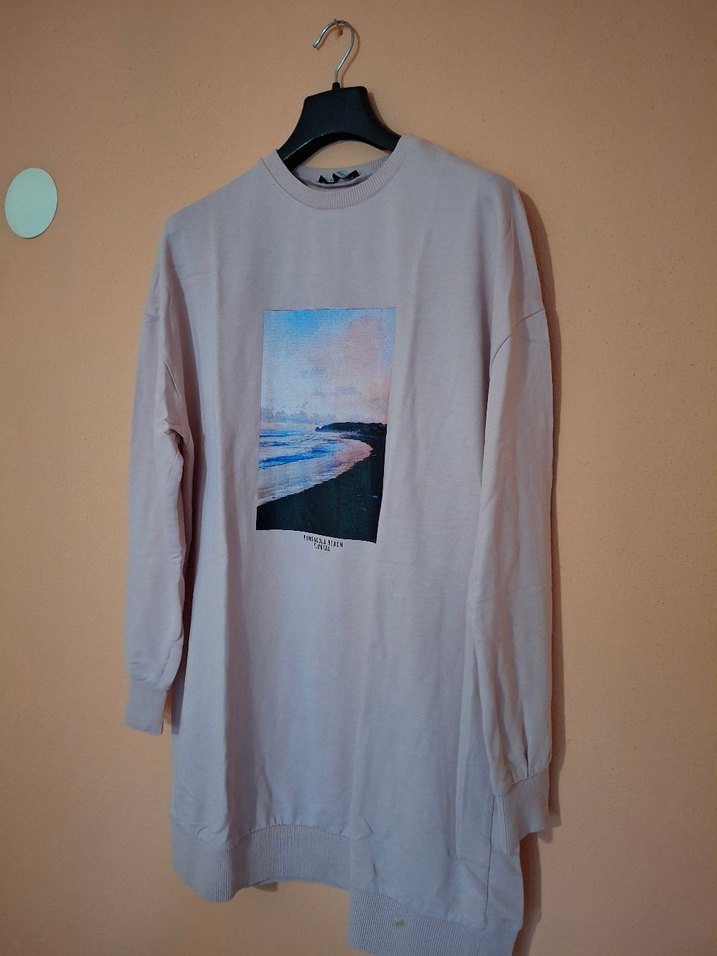Pamuklu, uzun kollu, bol kesim bej sweatshirt. Önünde sahil temalı baskı bulunur, günlük rahatlık ve şıklık sunar.