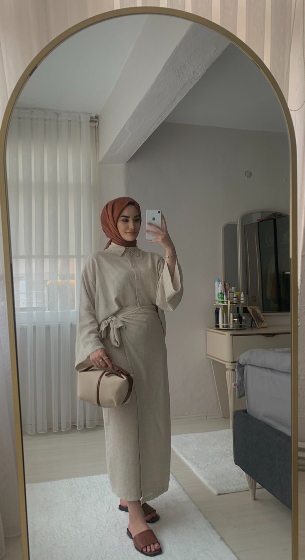 Bej renkte uzun kollu, yüksek yakalı ve pamuklu kumaştan yapılmış uzun etekli takım. Minimalist ve sade, günlük kullanıma uygun rahat kesim şıklık sunar.