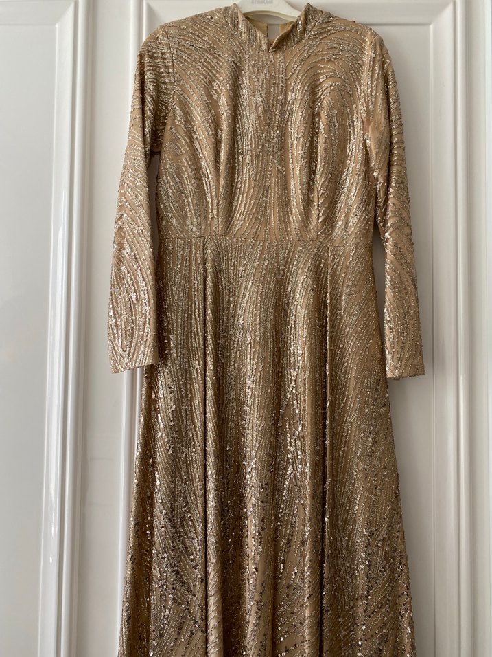 Parlak kumaştan, bej renkli, uzun kollu, drapeli ve kayık yaka uzun abiye elbise. Düğünler için uygun, bol kesim.