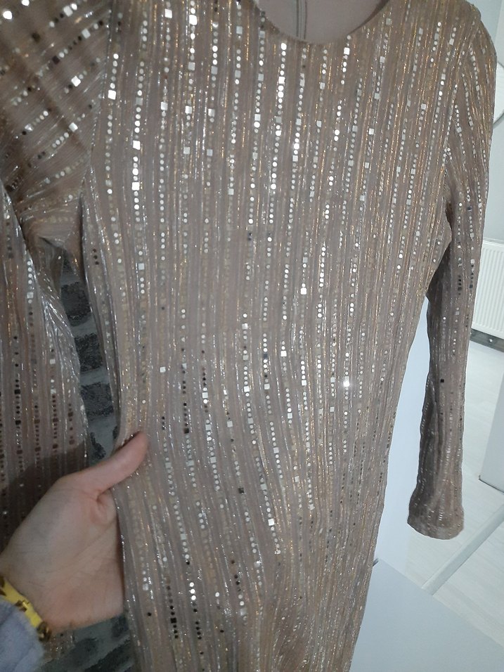 Bej renkli, uzun kollu ve yuvarlak yakalı bu abiye elbise, parlak payetlerle süslenmiş ve bohem tarzıyla partiler için uygundur. ✨