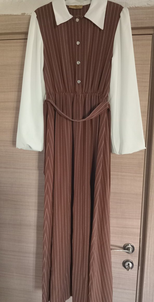 Bej pastel renkte, yüksek yakalı uzun kollu, pilili etekli bol kesim elbise. Yumuşak sentetik kumaştan üretilmiştir, günlük kullanıma uygundur.