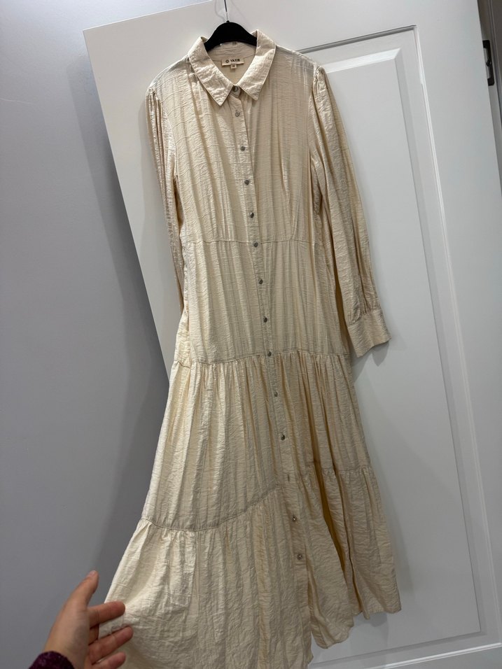 Bej renkli uzun kollu, yakalı ve pilili keten elbise. Bol kesimi ve düğme detaylarıyla bohem tarzını yansıtır. Günlük kullanım için uygundur.