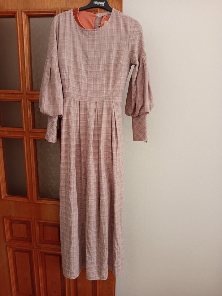 Bej renkte, keten kumaştan yapılmış, uzun kollu ve yuvarlak yakalı pilili uzun elbise. Rahat kalıplı ve vintage tarzda, günlük kullanıma uygundur.