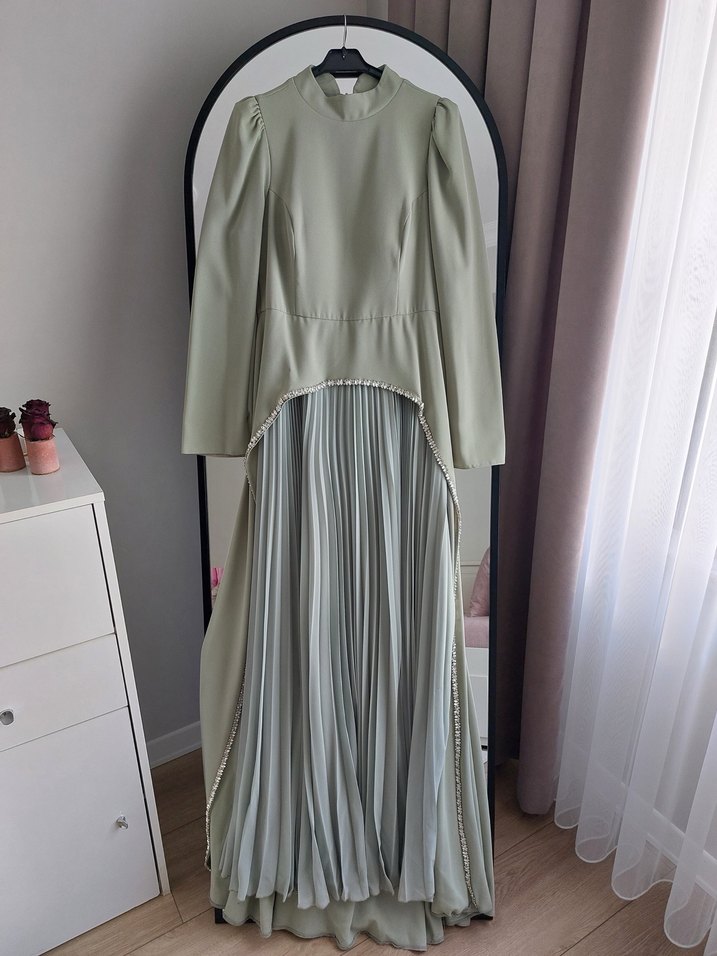 Bej renkli, uzun kollu ve piliseli detaylara sahip kadın elbisesi. Modern klasik tarzda, sentetik kumaştan, bol kesim ve yuvarlak yaka ile düğünler için uygun.