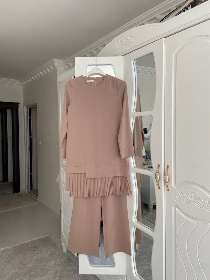 Bej renkte, uzun kollu, yuvarlak yakalı, piliseli etek ucu detaylı, sentetik kumaştan yapılmış tunik. Ofis için uygun minimalist tasarım.