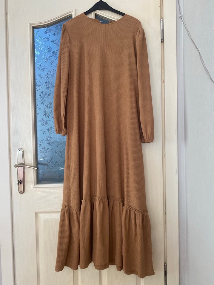 Bej renkli, keten kumaştan, uzun kollu ve piliseli detaylara sahip bol kesim elbise. Bohem ve sade tarzıyla günlük kullanım için uygundur.Kemerli