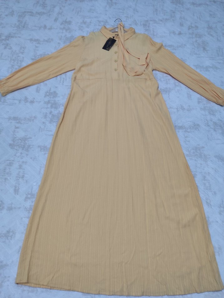 Bej renkte, uzun kollu, yüksek yakalı ve bol kesimli keten kumaştan piliseli uzun elbise. Minimalist bohem tarzda, günlük kullanıma uygun modest tasarım.