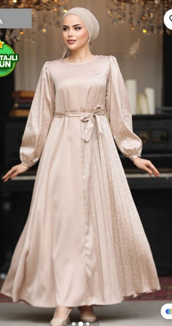 Bej Uzun Kollu Piliseli pamuk ipek saten Kadın Elbise