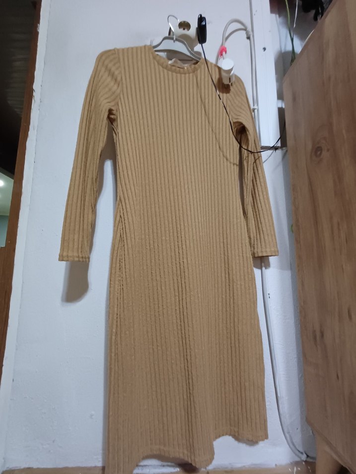 Bej renkte, uzun kollu ve piliseli detaylı, vücuda oturan uzun elbise. Yumuşak sentetik kumaştan yapılmış, yüksek yakalı, rahat ve gündelik kullanıma uygun bir parçadır.
