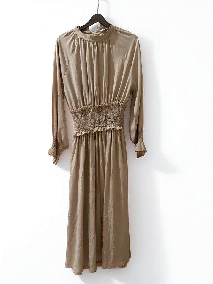 Bej renkte, piliseli detaylı, yüksek yakalı ve uzun kollu uzun elbisedir