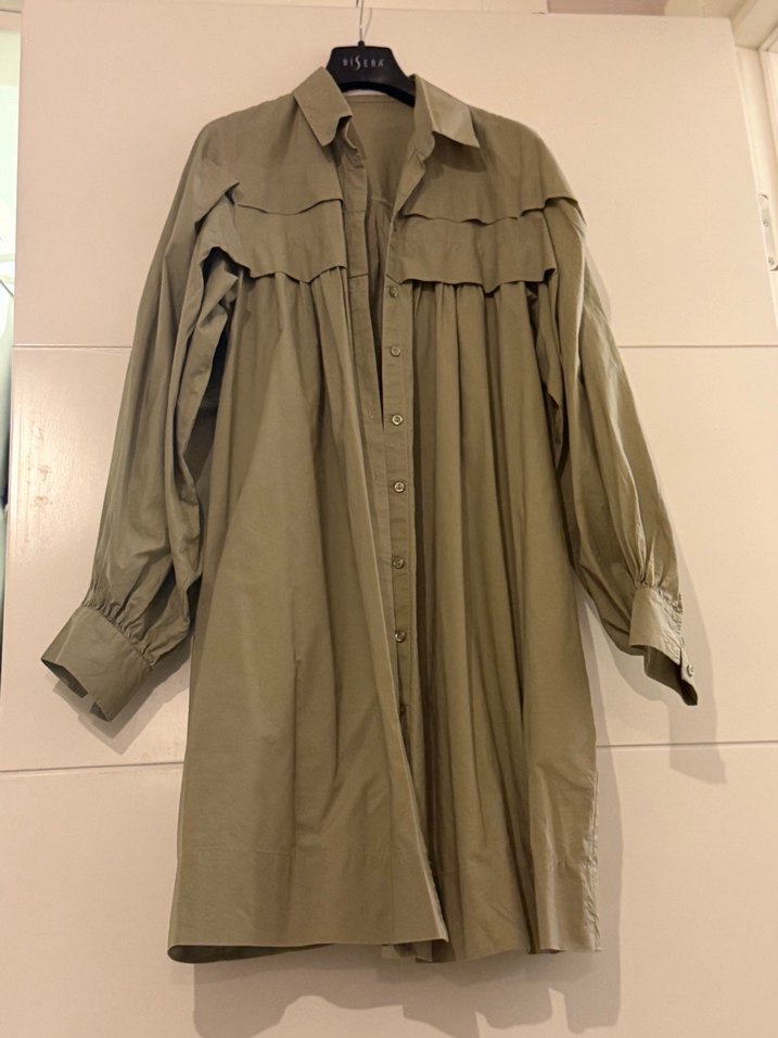 Bej renkli, keten kumaştan, pliseli detaylı, uzun kollu ve yakalı, rahat kesim kadın kabanı.