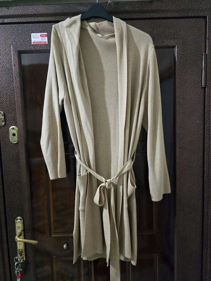 Bej renkte, uzun kollu, bol kesim ve kemerli kadın hırkası. Düz ve rahat dokusuyla konfor sağlar.