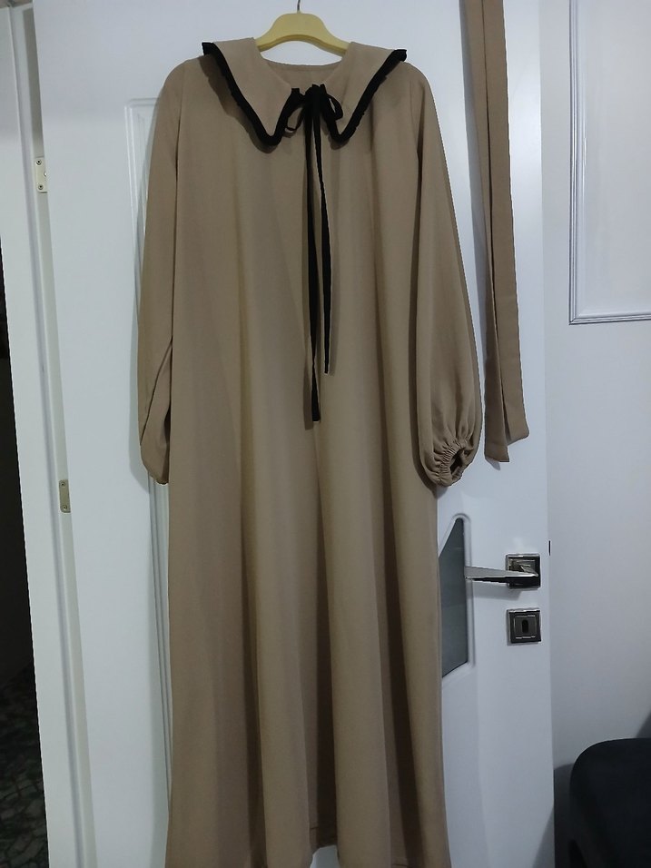 Bej renkte, uzun kollu, rahat kesim elbise. Sentetik kumaştan, yakasında siyah bağlama detayı ve dökümlü tasarımı vardır.