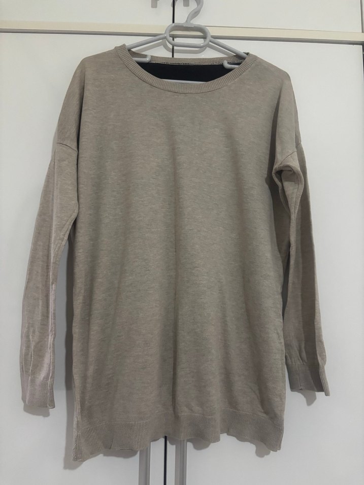 Bej kumaştan, uzun kollu ve yuvarlak yakalı, rahat kesim günlük kullanıma uygun kadın kazak.
