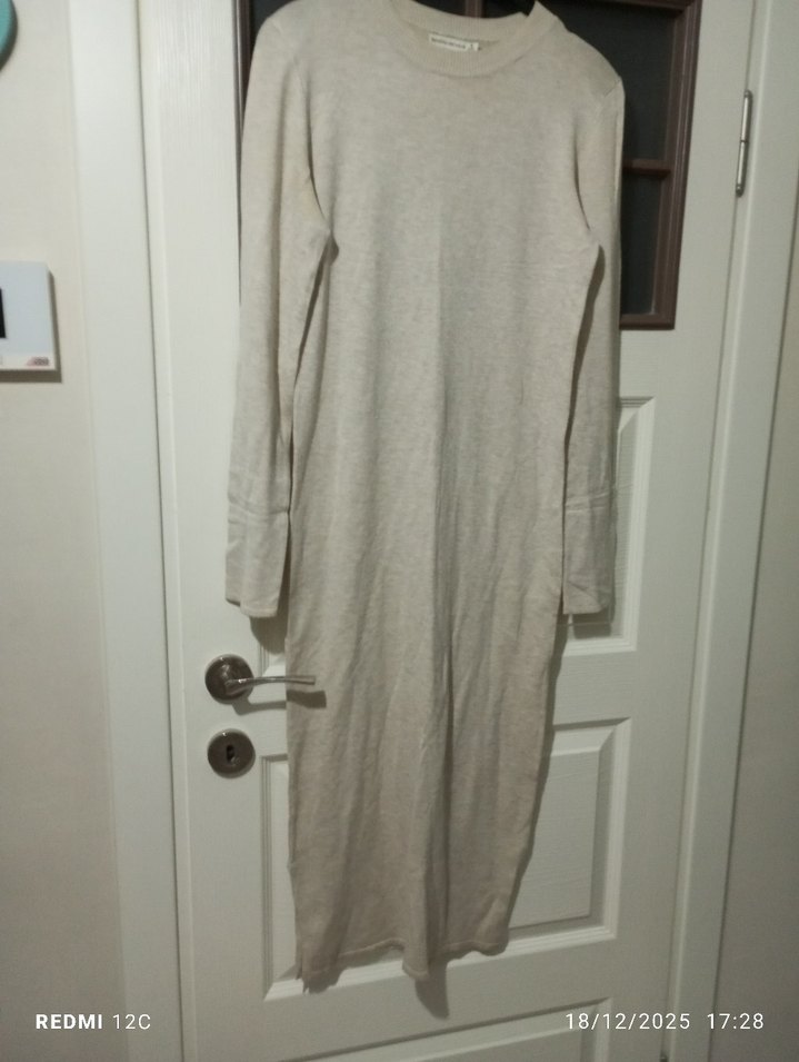 Yumuşak keten kumaştan, bej renkli, uzun kollu ve rahat kesim elbise. Yuvarlak yaka ve düz dokusu ile günlük kullanım için uygun.