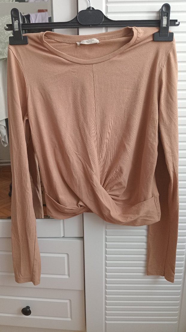 Yumuşak keten kumaştan yapılmış, bej uzun kollu, yuvarlak yakalı ve ön tarafında drapeli salaş kesim bluz. Rahat sokak stili için uygundur.