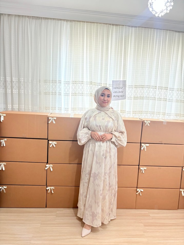 Bej renkte, uzun kollu, salaş kesim bohem elbise. Drapeli ve yüksek yakalı, bağlamalı desenli tasarım, sentetik yumuşak kumaştan üretilmiştir.
