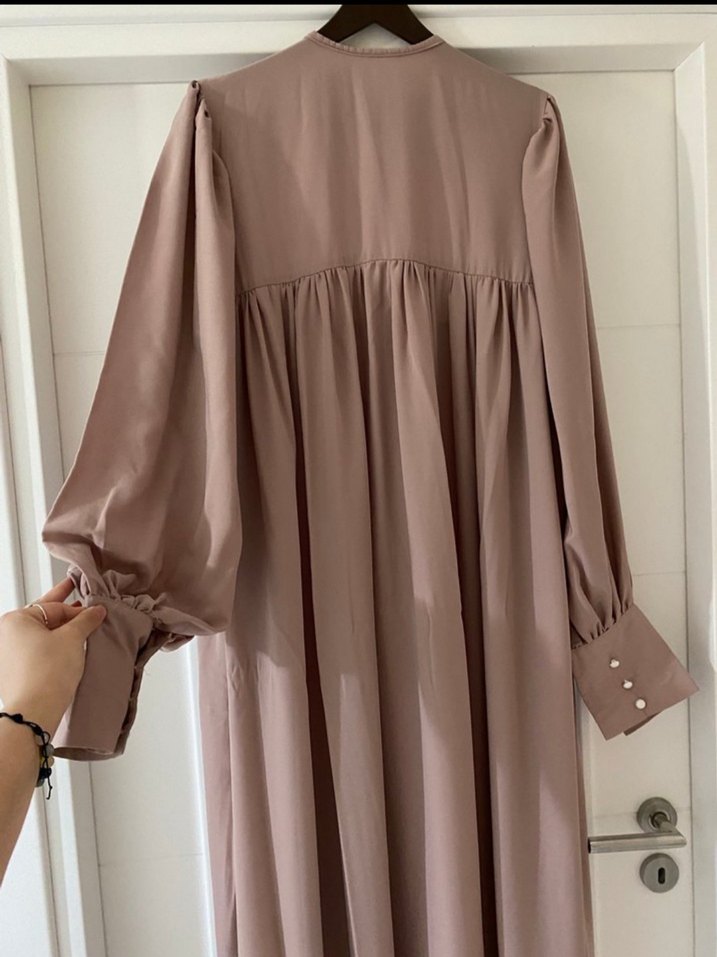Bej renginde, V yakalı, uzun kollu, salaş kesim ve dökümlü detaylara sahip ipeksi kumaştan uzun elbisedir. Minimalist ve mütevazı stilde günlük kullanım için uygundur.