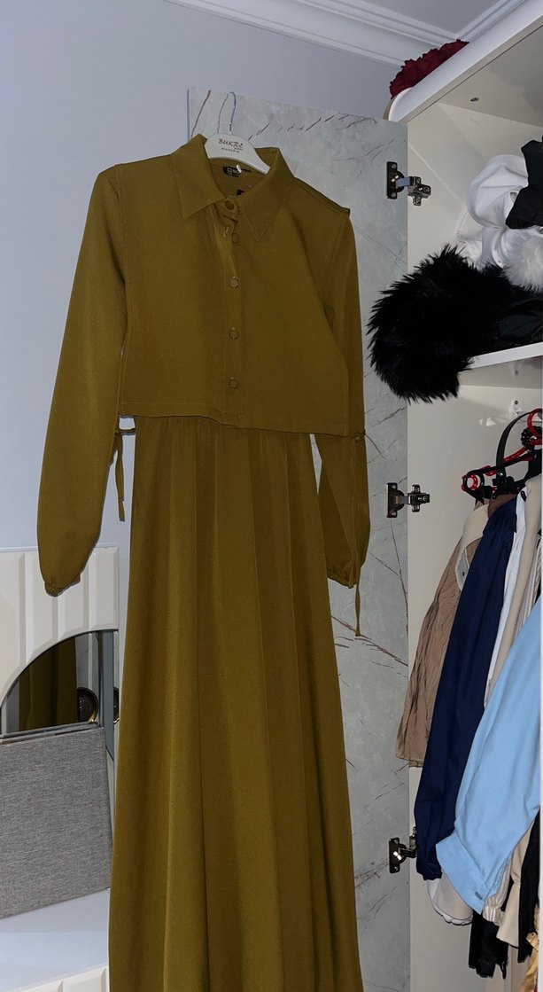 Bej renkli, uzun kollu, notalı yaka detaylı, salaş kesim ve drapeli tasarıma sahip uzun elbise. Sentetik kumaştan üretilmiştir, günlük rahat giyim için uygundur.