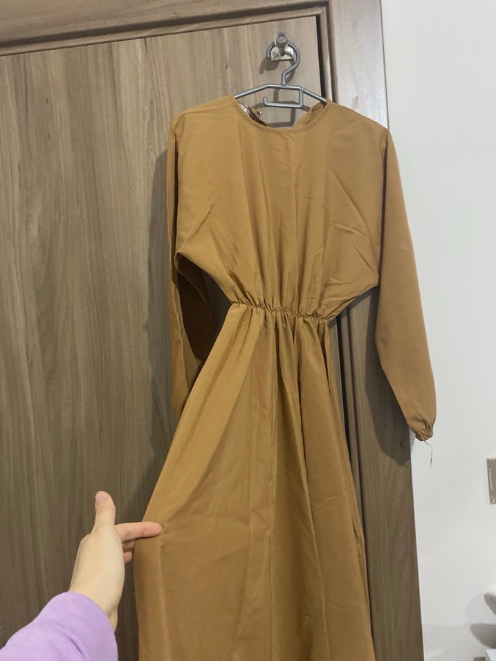 Bej renkli, uzun kollu ve salaş kesim elbise. Drapeli tasarımı ve yuvarlak yakası bulunur. Parlak sentetik kumaştan yapılmıştır.