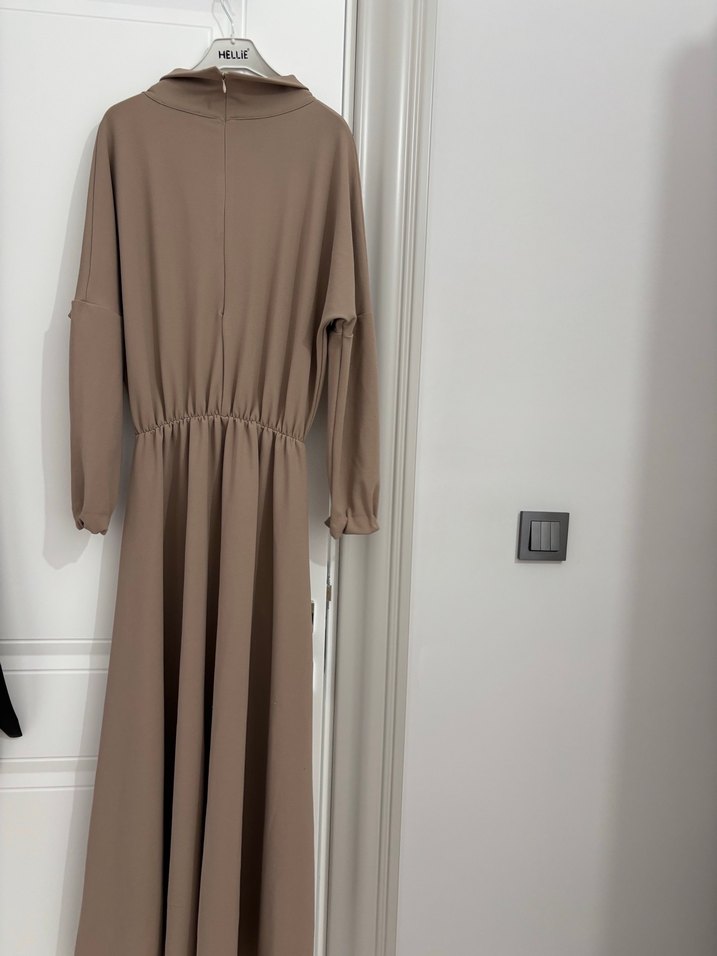 Bej renkte, uzun kollu, salaş kesim ve drapeli detaylara sahip uzun elbise. Yumuşak sentetik kumaştan, yüksek yakalı ve desensiz tasarımıyla sade ve modern bir görünüm sunar.