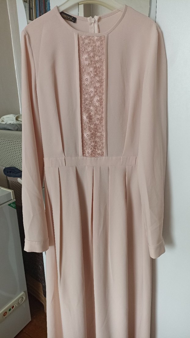 Bej renkte, uzun kollu, salaş kesimli ve drapeli uzun elbise. Ön kısmında dantel detaylı, mütevazı ve bohem tarzda günlük kullanıma uygundur.