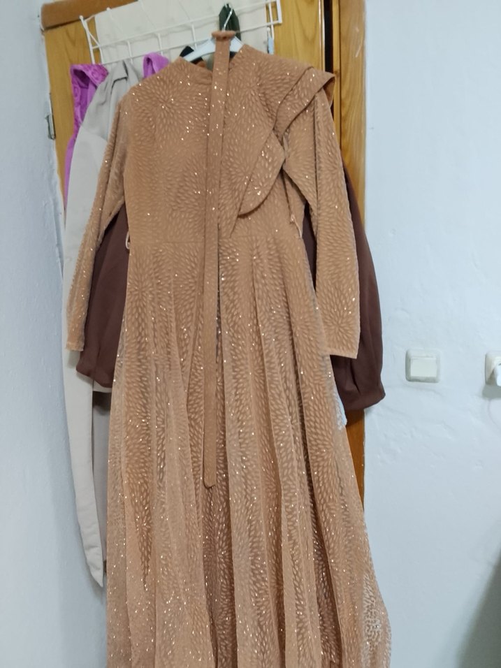 Bej renkli, uzun kollu, salaş kesim ve drapeli detaylara sahip kadın elbisesi. Notlu yaka tasarımı ve parlak dokusu ile bohem tarzı sunar.